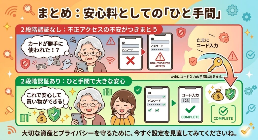 私の親も、今回の件をきっかけに2段階認証を取り入れ、「これで安心して買い物ができる」と少し自信を取り戻したようです。 大切な資産とプライバシーを守るために、今すぐ設定を見直してみてくださいね。