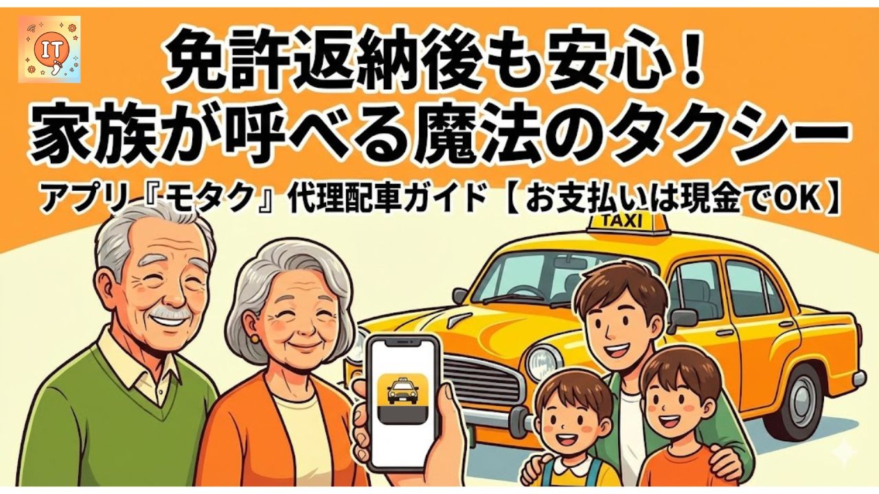 簡単に言うと、「スマホを使えるお子さん(ご家族)が、自分の『モタク』アプリを操作して、親御さんのためにタクシーを手配してあげる」方法です。