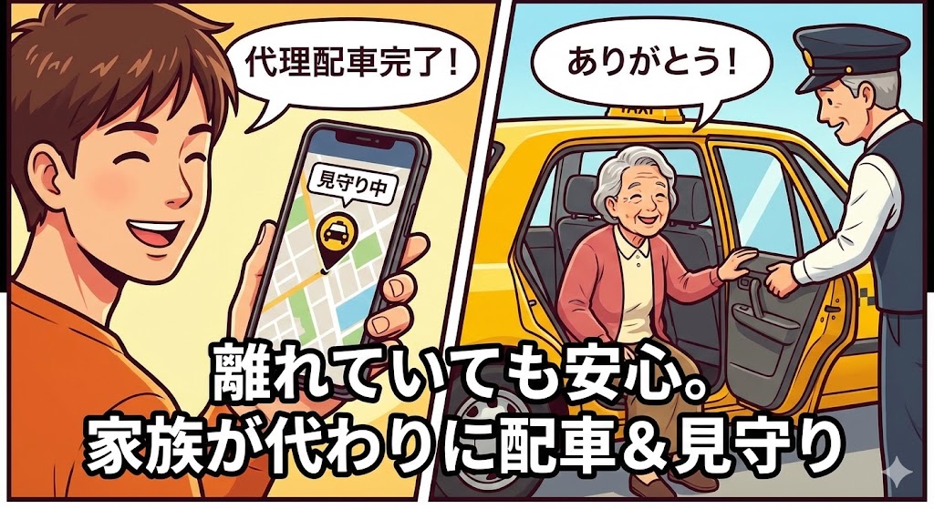 しかも、「スマホが苦手な親御さんの代わりに、離れて暮らす家族がタクシーを呼んであげる」ことができるんです。