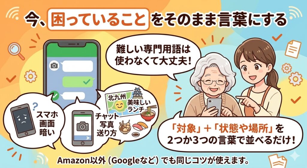 Amazon以外(Googleなど)で「スマホの使い方がわからない!」という時も、同じコツが使えます。難しい専門用語は使わなくて大丈夫です。