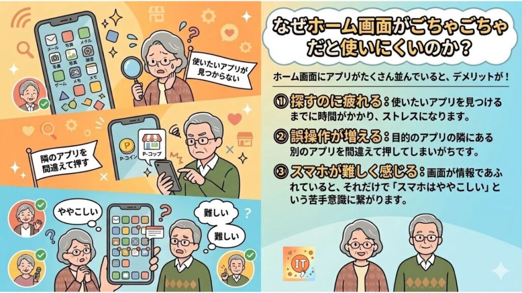 • スマホが難しく感じる: 画面が情報であふれていると、それだけで「スマホはややこしい」という苦手意識に繋がります。