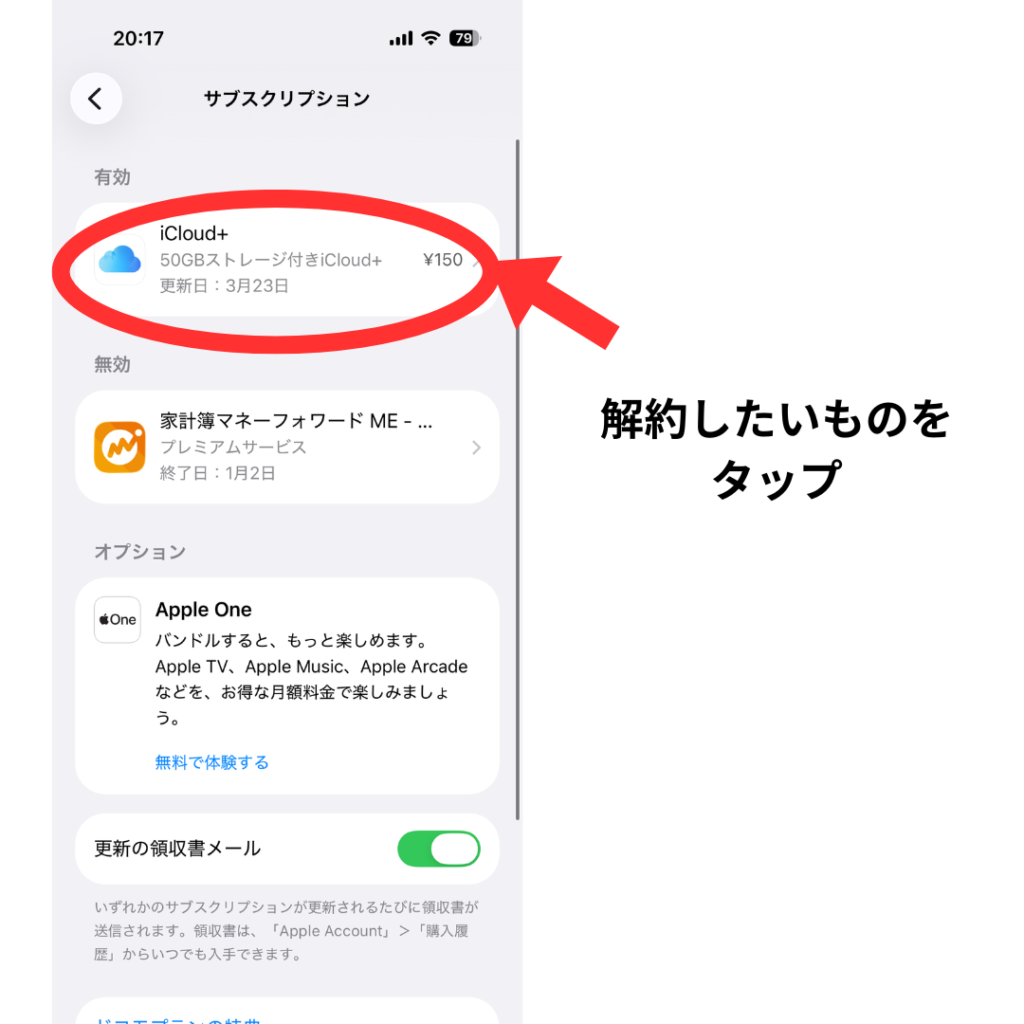 ここに表示されているのが、現在毎月(または毎年)お金を払っているサービスです。もし「これ、使っていないな」というものがあれば、その名前を押して「サブスクリプションをキャンセルする(または無料トライアルをキャンセルする)」を押せば、解約完了です!