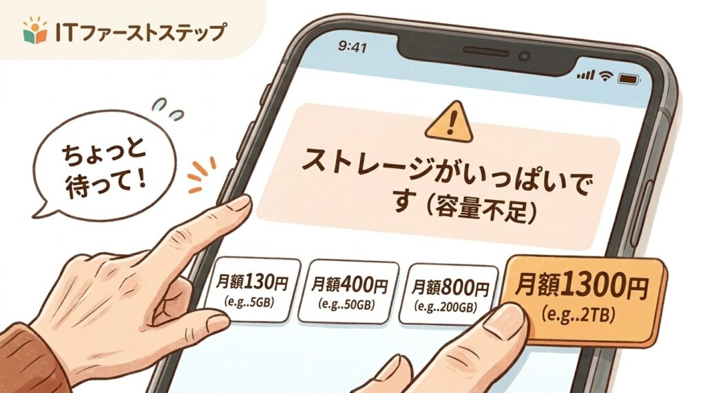 iPhoneでもAndroidでも、長く使って写真や動画が貯まってくると、この警告が出ます。「データが消えちゃうの!?」と焦って画面の指示に従うと、有料のデータ保存サービス(iCloudやGoogle Oneなど)の契約画面に進んでしまいます。