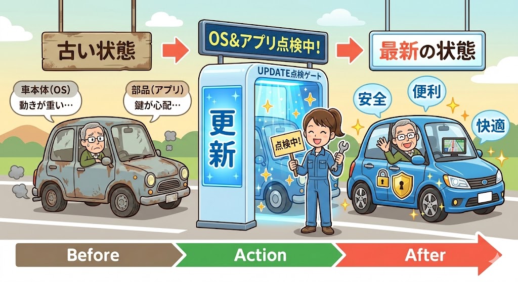 - スマホ本体の更新(OSの更新): 車本体の点検と改良(iPhoneの「iOS」や、Androidのシステムのことです)